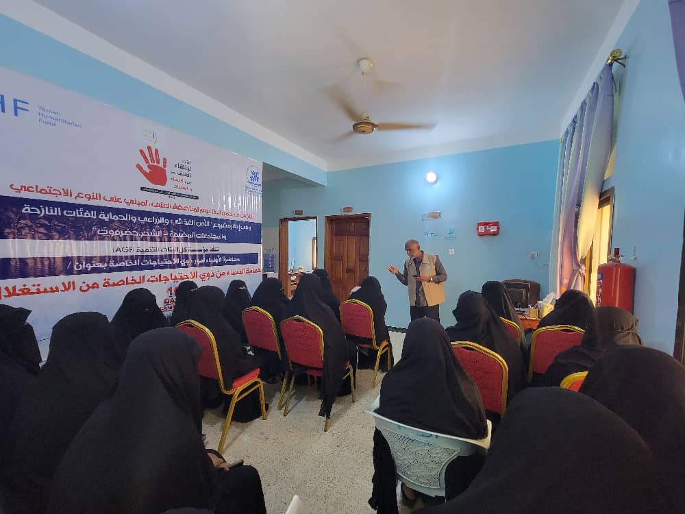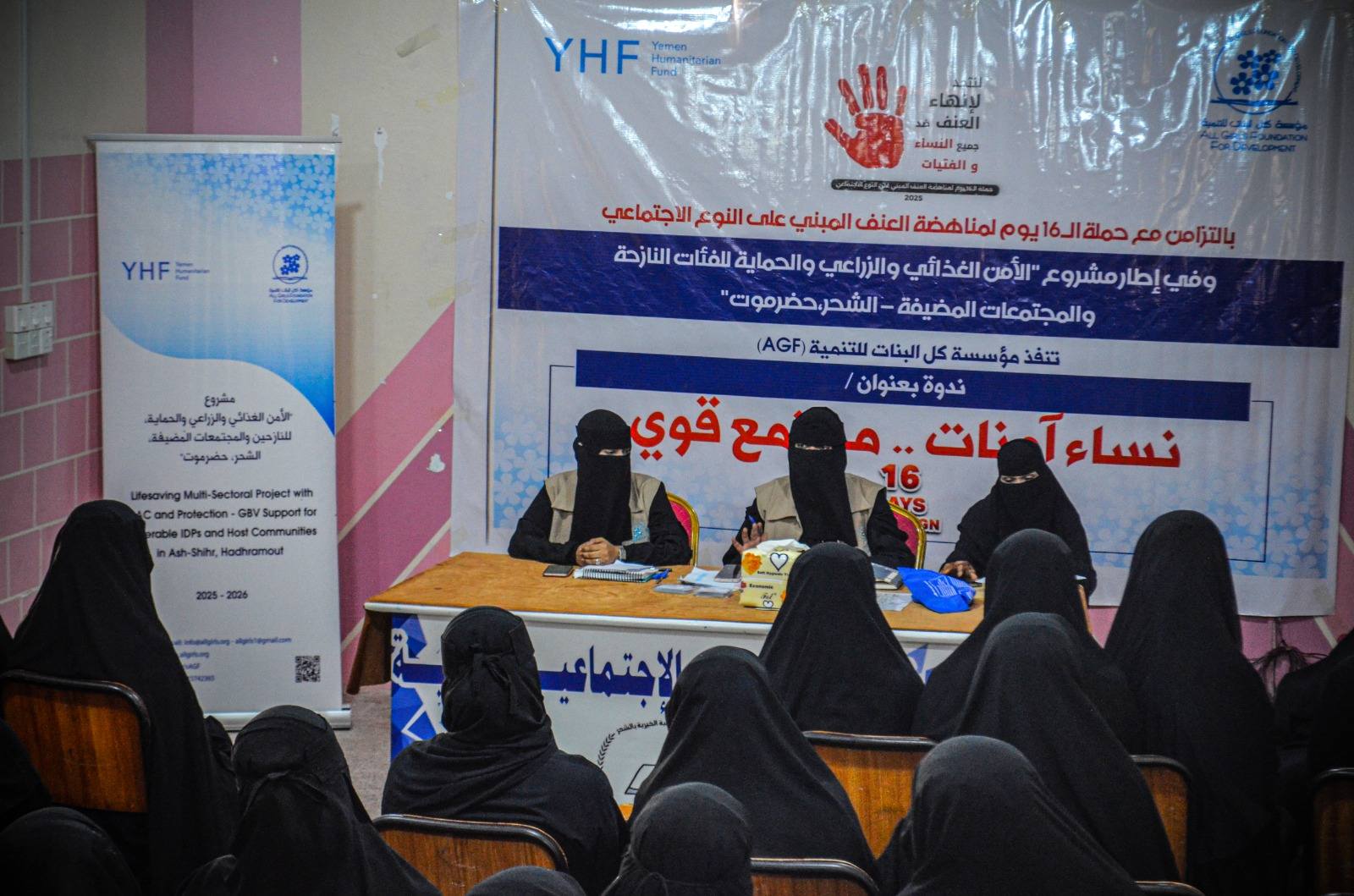 In Al-Shihr, Hadramout Governorate, and within the framework of the Food Security, Agriculture, and Protection Project for displaced families and host communities, the All Girls Foundation for Development (AGF) organized a seminar titled "Safe Women… Strong Community."The seminar aimed to introduce 60 women to protection methods and to highlight the role of the family in addressing violent behaviors against women.